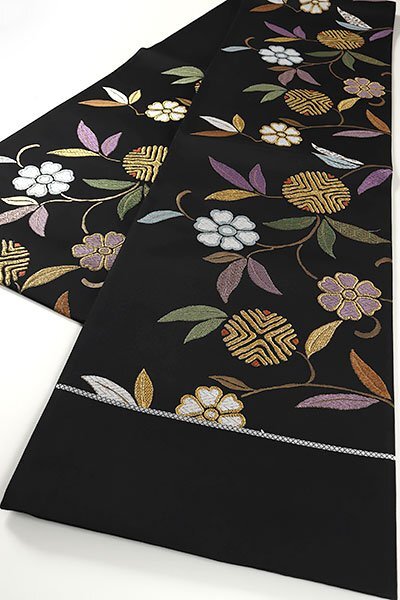 ※こちらの商品にはお仕立てはついておりません。表地のみのご提供でございます。 (お仕立て上がりの長さ目安:約4m51cm) 西陣織元『大光』謹製、高級袋帯(六通)をご紹介致します。 しなやかな帯地は、黒色のお色目でございます。 全体には白色、藤色、灰緑色、ライトブルーなどのお色目で笹蔓文が大きく織り出されております。 金糸もふんだんに施され、黒地に雅やかな古典模様が映えます。 -状態・素材:絹:35% 綿:35% レーヨン:15% ポリエステル:15% -落款・証紙:西陣織工業組合 証紙No,2362 大光謹製 -参考着用年代: 20代~幅広い年代でお召しいただけます -着用時期 :10月~5月 -合わせる着物: 訪問着、付下げ、色無地など
