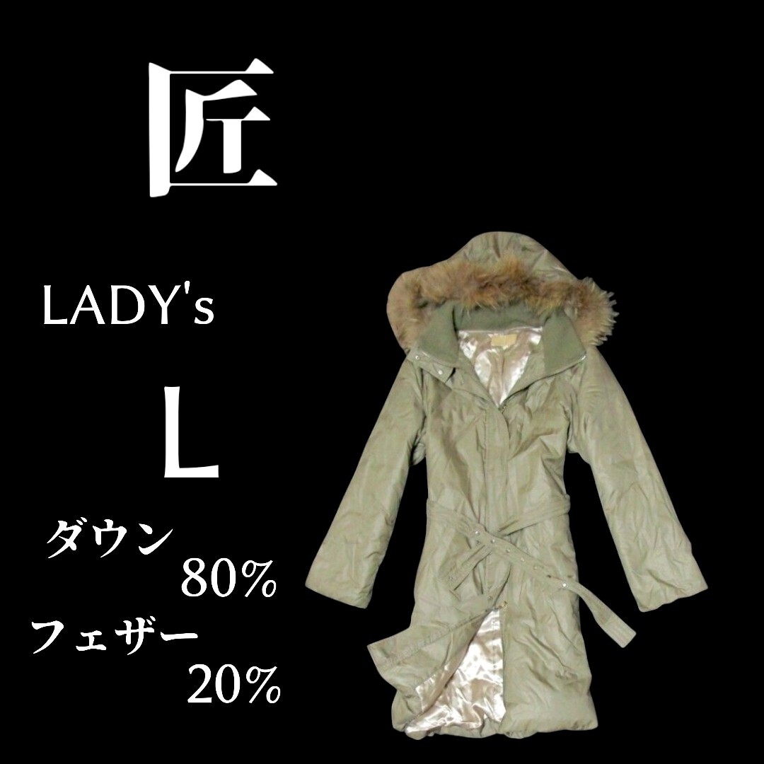 > レディースLサイズ 匠 ダウンコート ファー&フード取外可 カーキ色