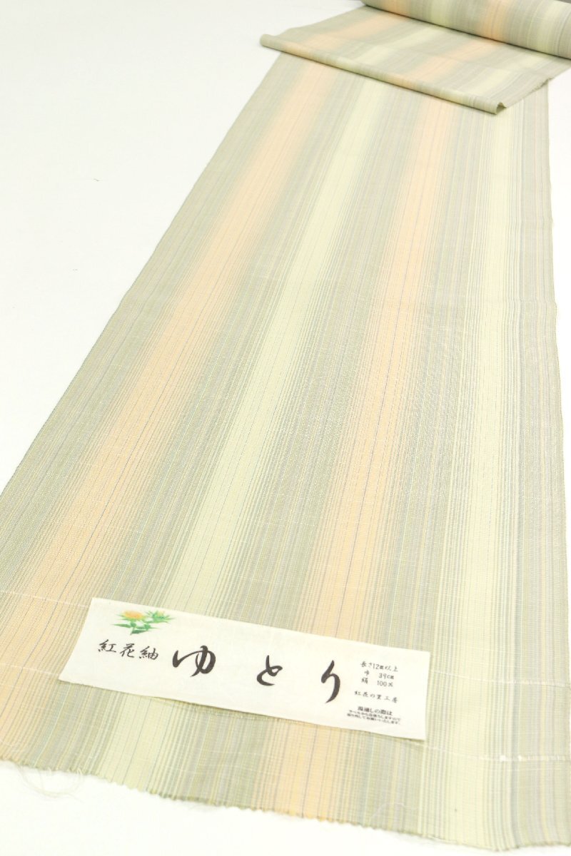 ※こちらの商品にはお仕立てはついておりません。 (布幅:39cm) みちのく紅花の里工房紬着尺をご紹介いたします。 ややほっこり感のある風合い豊かな紬地は、裏葉柳色や苗色、薄いオレンジ色のお色目でグラデーションのように織り上げられております。 -状態・素材:新品 未仕立 正絹 -落款・証紙: -参考着用年代:20代~幅広い年代でお召しいただけます。 -着用時期 :10月~5月