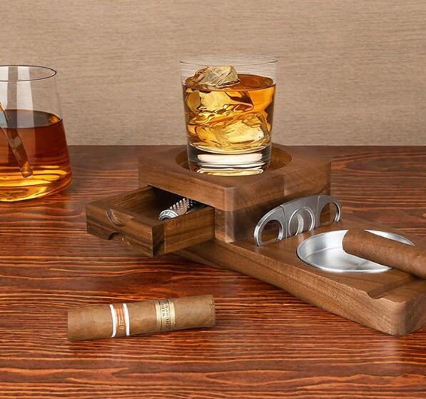 - 新品葉巻木製灰皿セット ウッドシガー灰皿シガーカッター パンチカッター たばこ 高光沢 父の日 プレゼント 木製 ウイスキーグラスホルダー