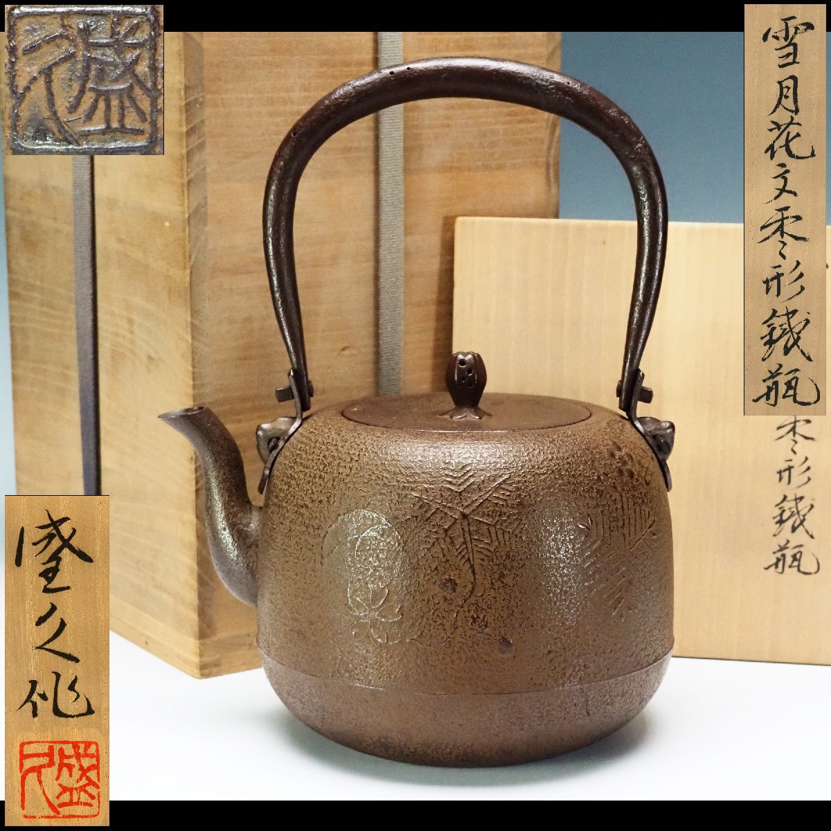 > 【治】南部名工『鈴木盛久』作 雪月花紋棗形鉄瓶☆共箱 (検索:南部鉄瓶 小泉仁左衛門 及川寛治 高橋萬治 有坂) 本物保証 BCF06