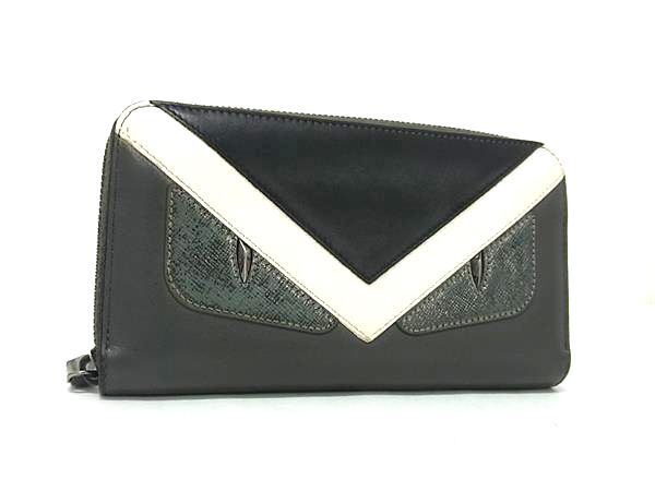 > 1円 FENDI フェンディ バッグバグズ モンスター レザー ラウンドファスナー 長財布 ウォレット 小銭入れ ダークグレー系 FQ3008