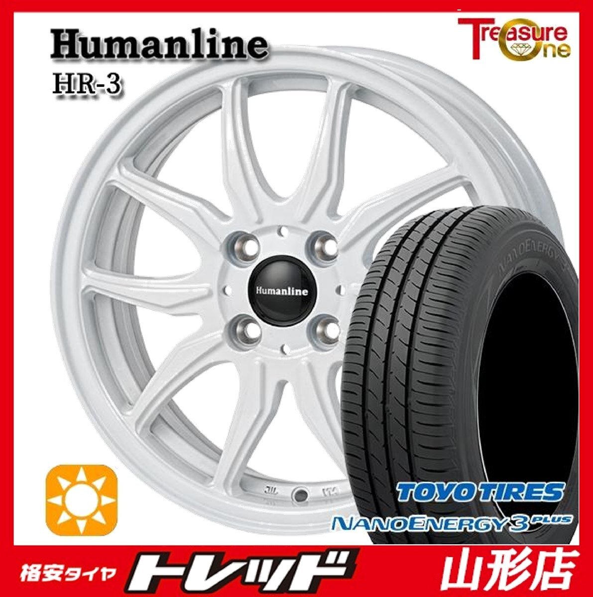 > 山形店 新品 タイヤホイールセット ヒューマンラインHR-3 15インチ 5.5j 4H100 +42 ホワイト TOYO ナノエナジー3プラス 175/65R15 2025年製