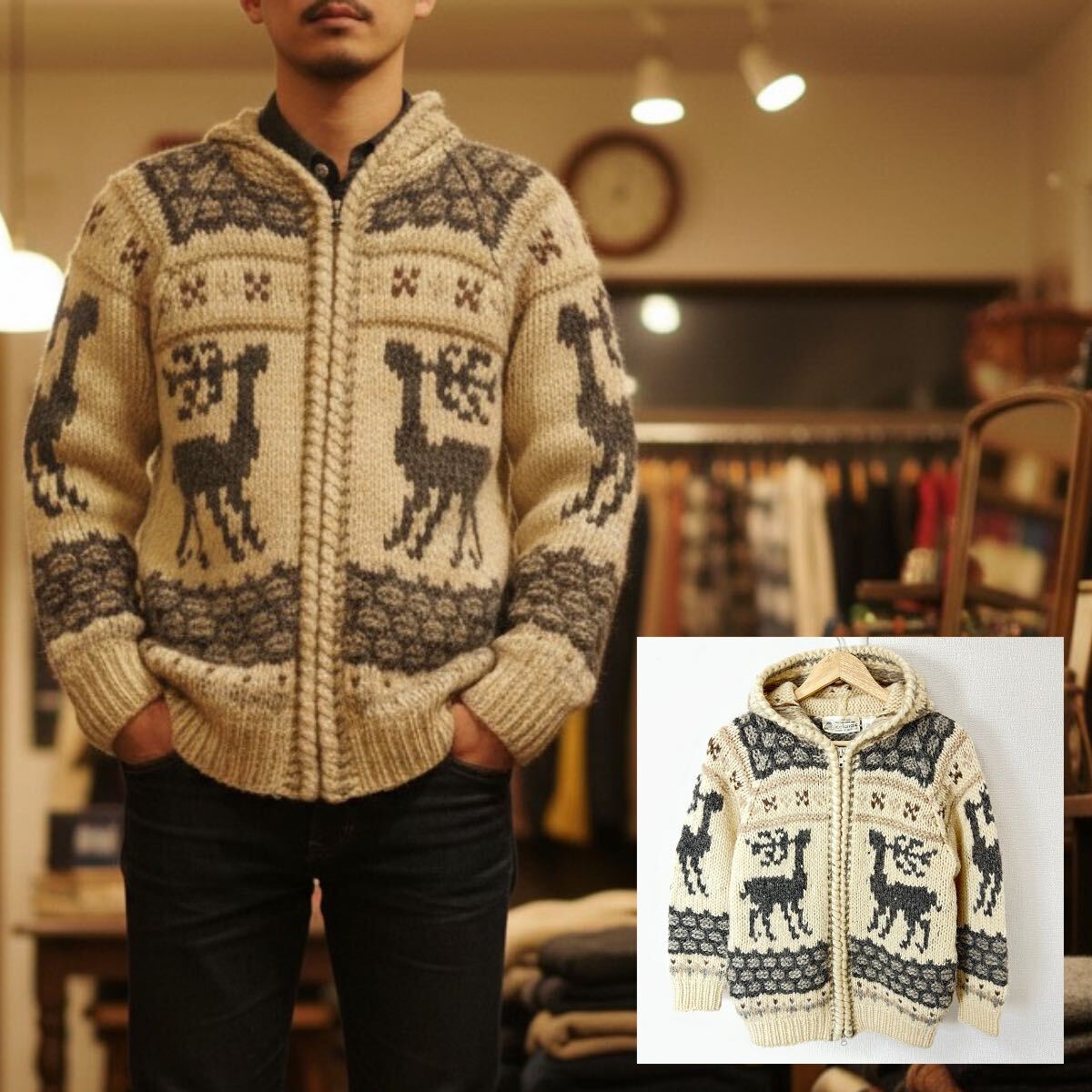 > ハンドメイド◎ダブルジップ仕様◎【icelandic】アイスランディック カウチンニットパーカー ウール100% アイボリー メンズ/Y37843YY