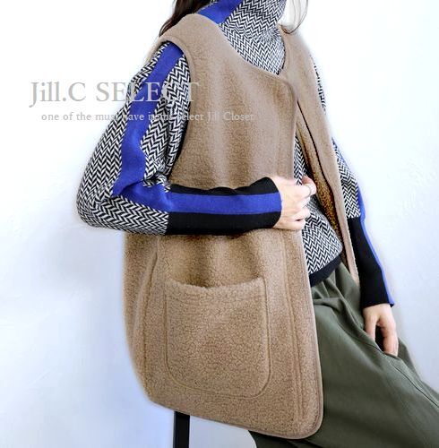 - 新品【送料185円】ノーカラー ラウンドネック フロントジッパー ボアベスト*ポケット付き♪7718.BEIGE