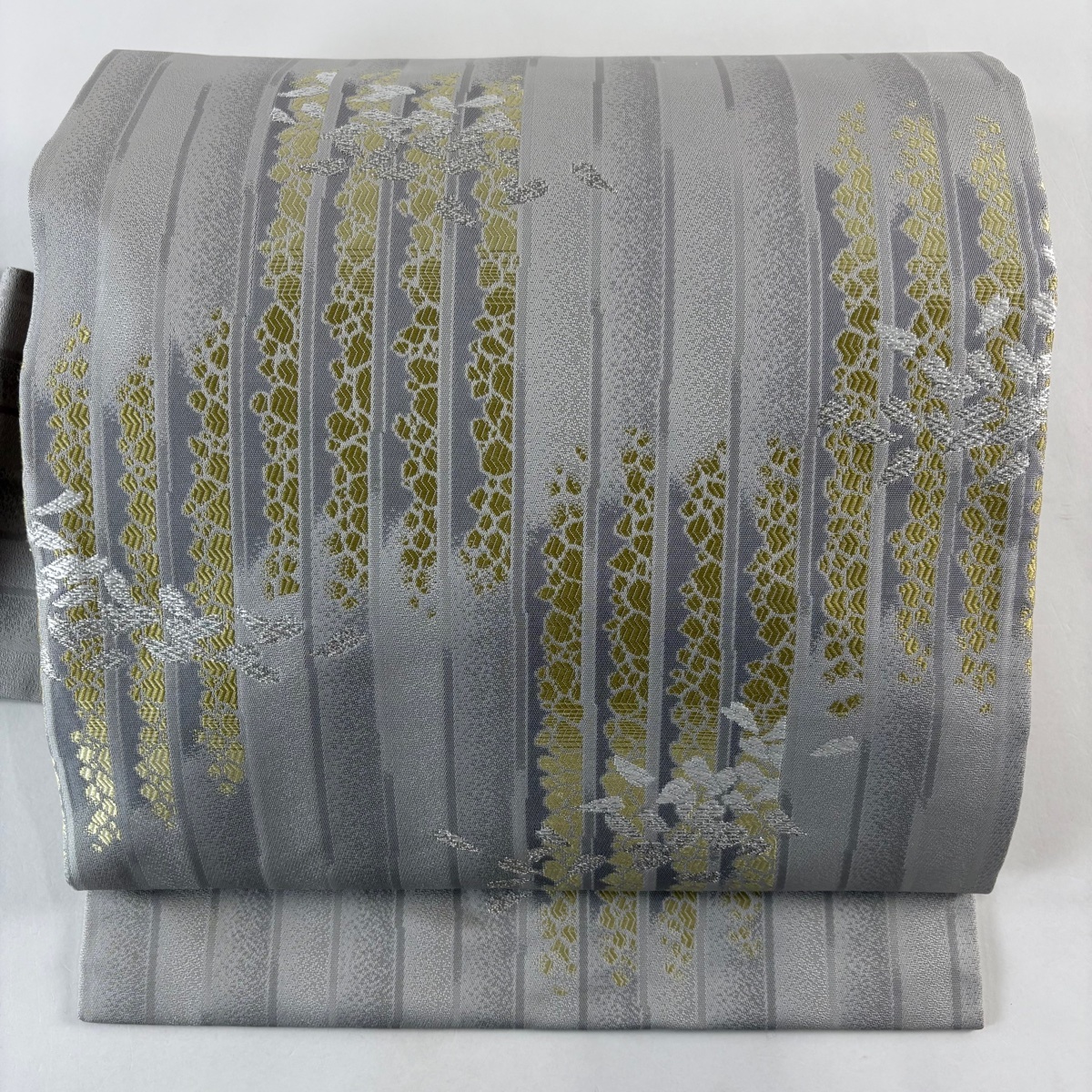 - 【美品】 名古屋帯 名品 縞 桜の花びら 銀糸 灰色 正絹 【中古】