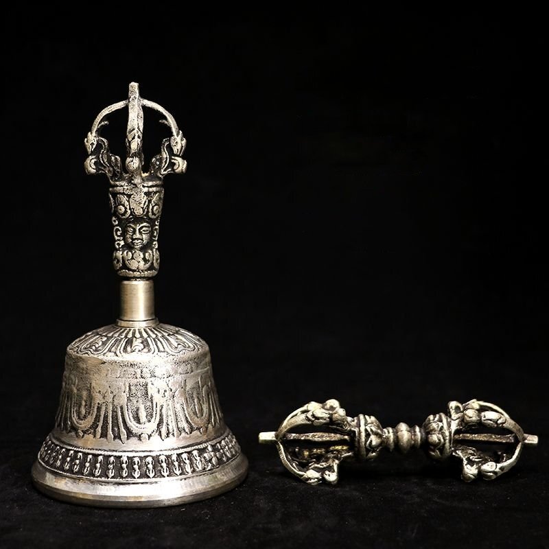 > 2点セット 唐密 東密 チベット 金剛杵 五鈷鈴 金剛鈴 持鈴 密教法具 チベット仏教 白銅製 寺院仏具 法器 法具 魔除け 厄除け 中 ZH1726