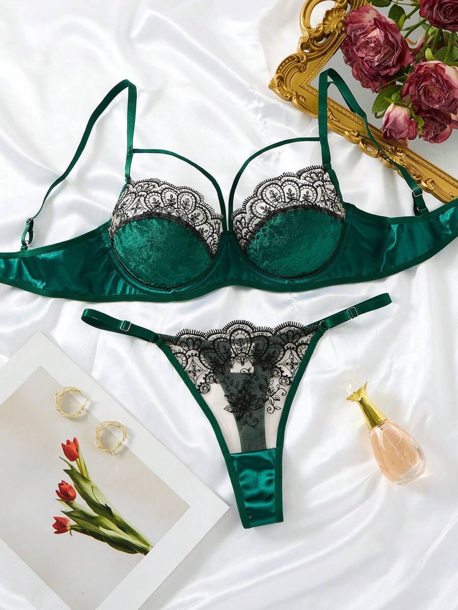 > インティメート ブラジャー ショーツ セット 2枚セット レディース ダークグリーン 刺繍レース セクシーランジェリー、グリーンベ