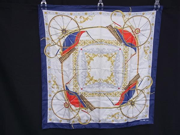 > ■美品■ CELINE セリーヌ シルク100% 総柄 大判 スカーフ ストール ショール レディース ネイビー系×マルチカラー DJ5489