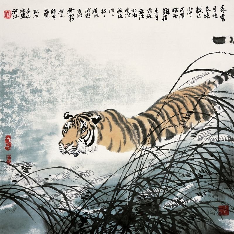 - 中国水墨画 トラ 虎 下山虎 中国美術 表装なし 画仙紙 画芯 玄関画 鑑賞 装飾 郵便発送 48*48cm zh983