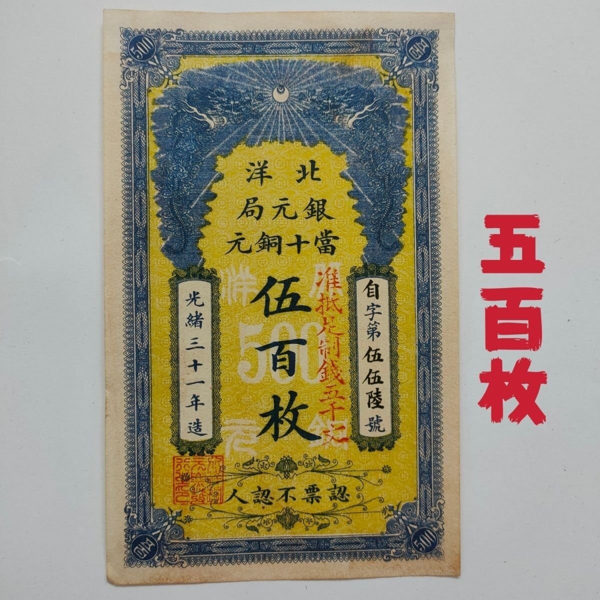 - 送料無料 中国紙幣 銀票 清朝 光緒三十一年 北洋銀元局 五百元 大清銀票 美品 外国貨幣 簡易包装 郵便発送 ZH692