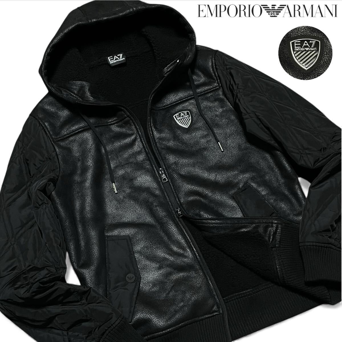 - 未使用級/L相当●エンポリオアルマーニ ブルゾン フェイクレザー ムートン 切替 ダブルジップ 裏地ボア ロゴワッペン EA7 黒 EMPORIOARMANI