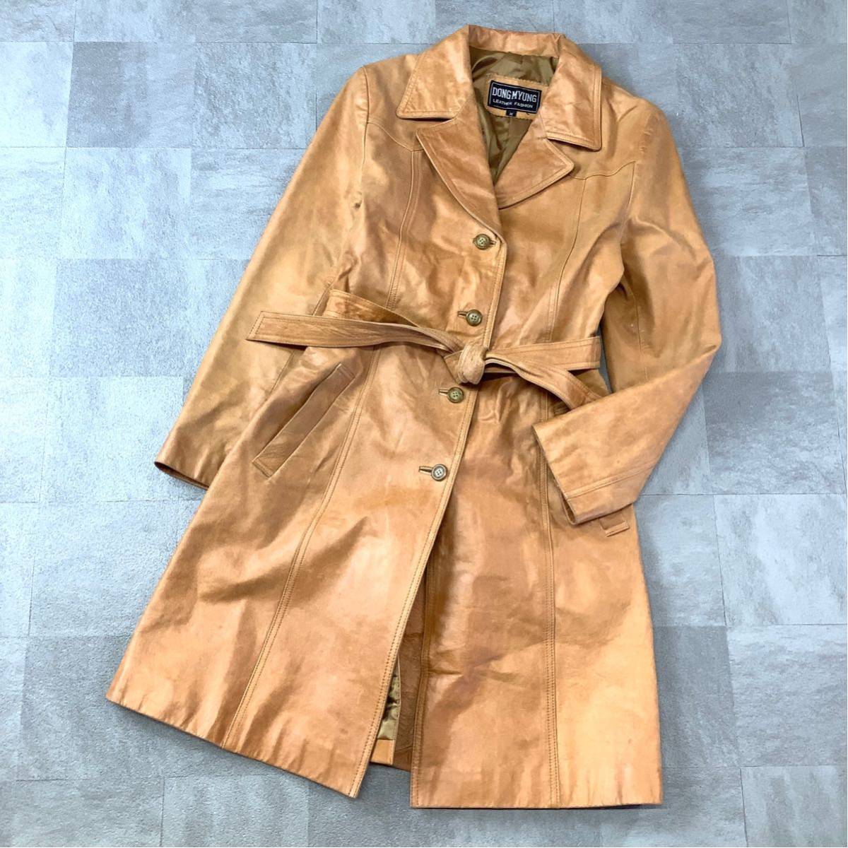 > 本革 DONG MYUNG 牛革 レザーコート レディース Mサイズ ブラウン 抜群なシルエット ロングコート トレンチコート