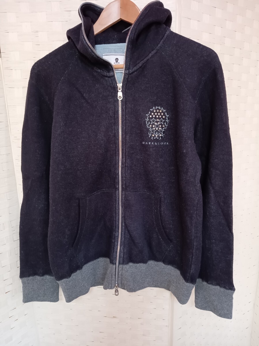 > MARK&LONA ニット フルジップパーカー ネイビー系 Lサイズ ゴルフウェア メンズ マークアンドロナ やや毛羽立ちあり