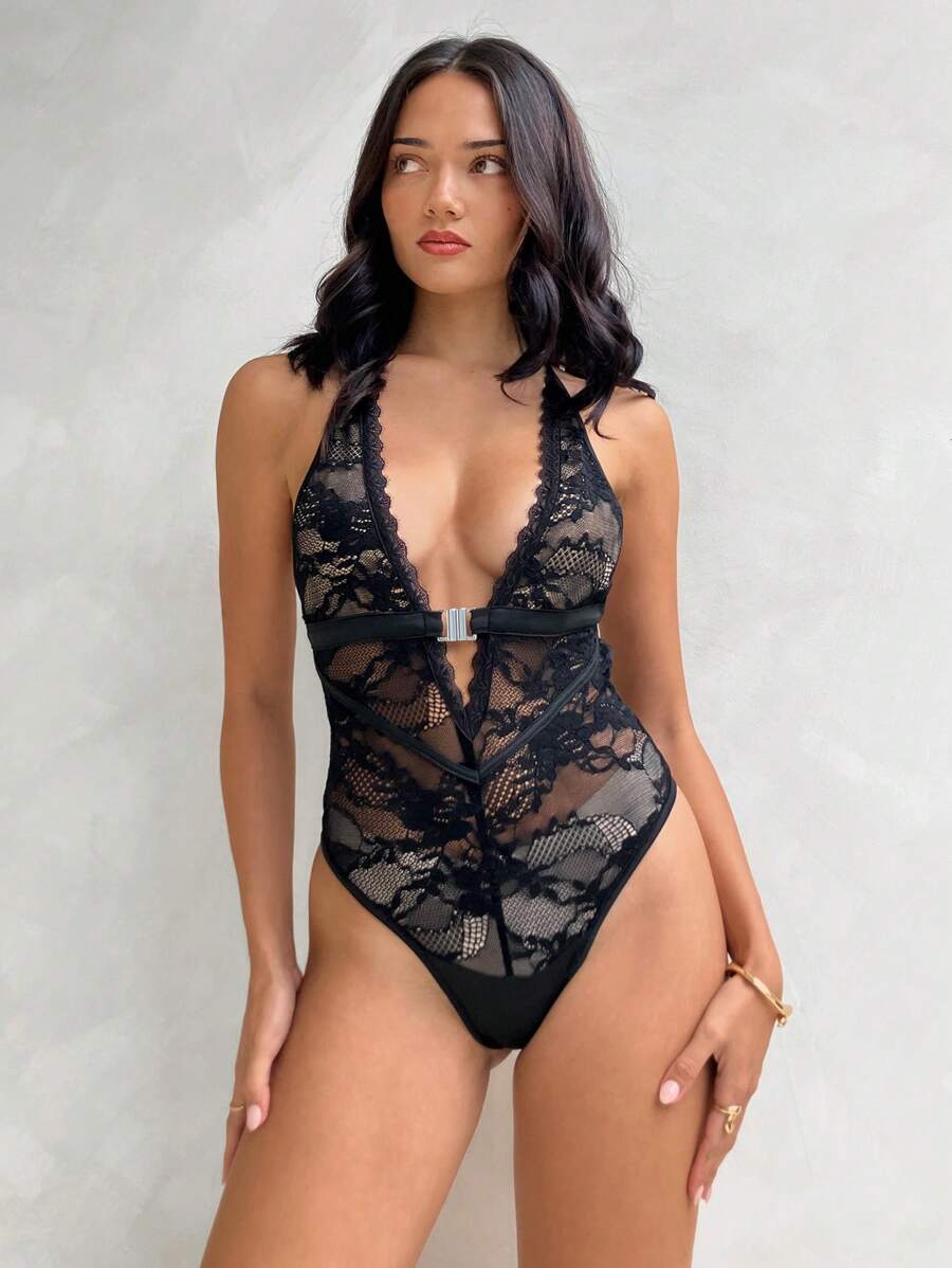 - ボディスーツ ディープネック メタルバックル装飾 レースボディースーツ (レディース)