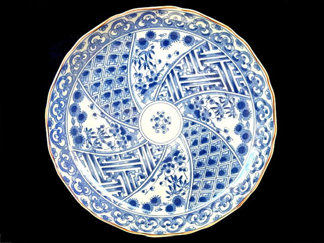 - 和食器●青洲造●大皿●有田焼●グレーに青で古典柄●27.5cm