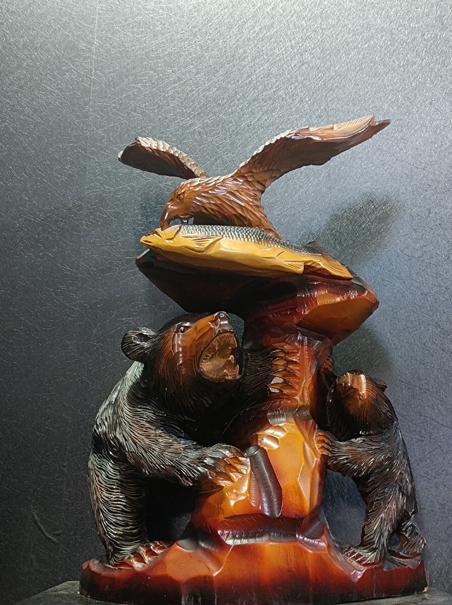- 北海道 伝統的民芸品 木彫り 鮭をくわ えた親子熊 上部鷲 インテリア 木製