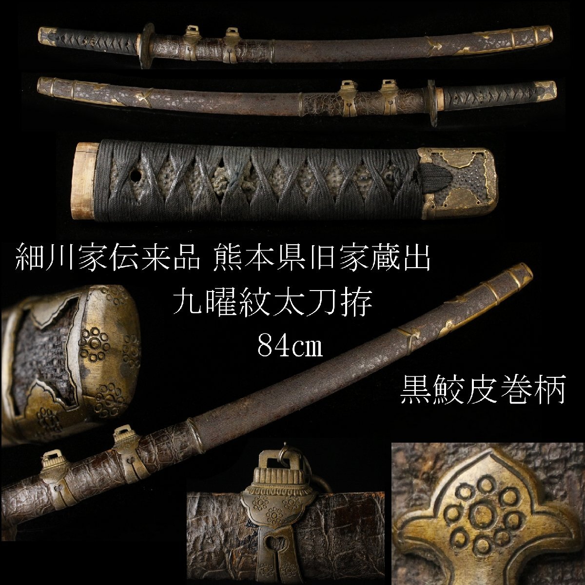 - 【LIG】細川家伝来品 熊本県旧家蔵出 九曜紋太刀拵 84㎝ 黒鮫皮巻柄 彫金金具 鉄地象嵌鍔 外装 刀装具 [.QE]25.11