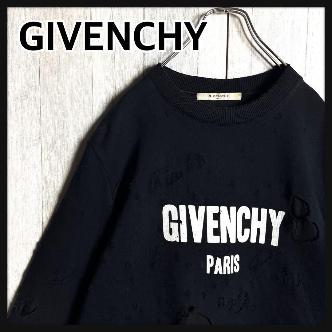 - 【希少人気デザイン・美品】ポルトガル製 GIVENCHY ジバンシー センターロゴ デストロイ加工 オーバーサイズ スウェット ブラック・黒 M