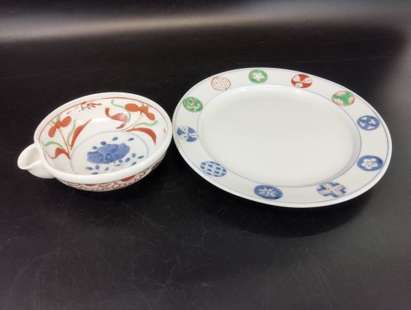 > サ/ 有田焼 福珠窯 染綿丸紋 丸皿 24.5㎝ 片口小鉢 赤絵 2種 まとめて /HY-1284