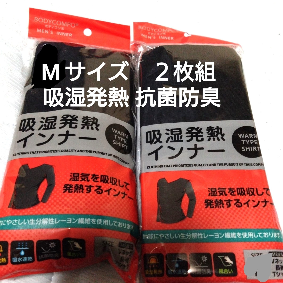 > ⑤メンズ 紳士 インナーウェア 吸水速乾 保温 吸湿発熱加工 抗菌防臭 Mサイズ 2枚組 アンダーシャツ ブラック Vネック