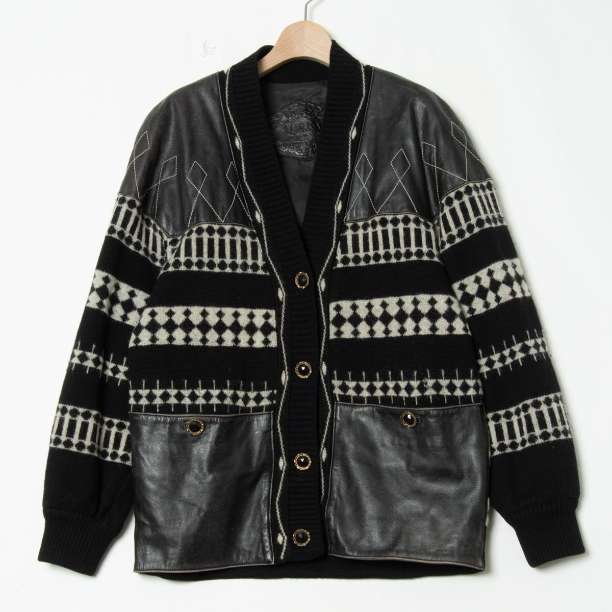 - 【1円スタート】スペイン製 TORRAS レザー切替ニットカーディガン レディース 44サイズ ウール/本革 クラシカル エレガント 黒 ブラック