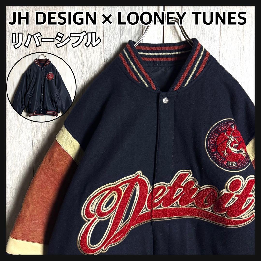 > 【超希少・美品】90s JH DESIGN ジェフハミルトン 全刺繍 リバーシブル 本革・レザー切替 スタジャン ブルゾン ネイビー・紺 L