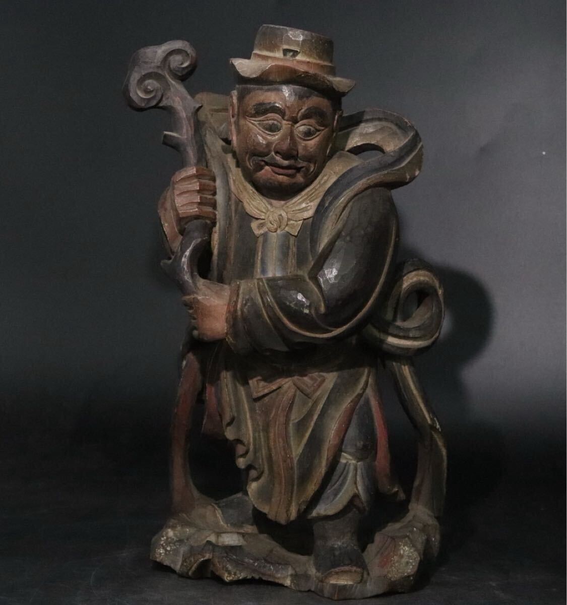 - 木彫 彩色 仏像 木造 大型 高約37cm / 検索: 大黒天 大黒様 走り大黒 民衆仏 民仏 閻魔大王 閻魔 中国美術 .B1415