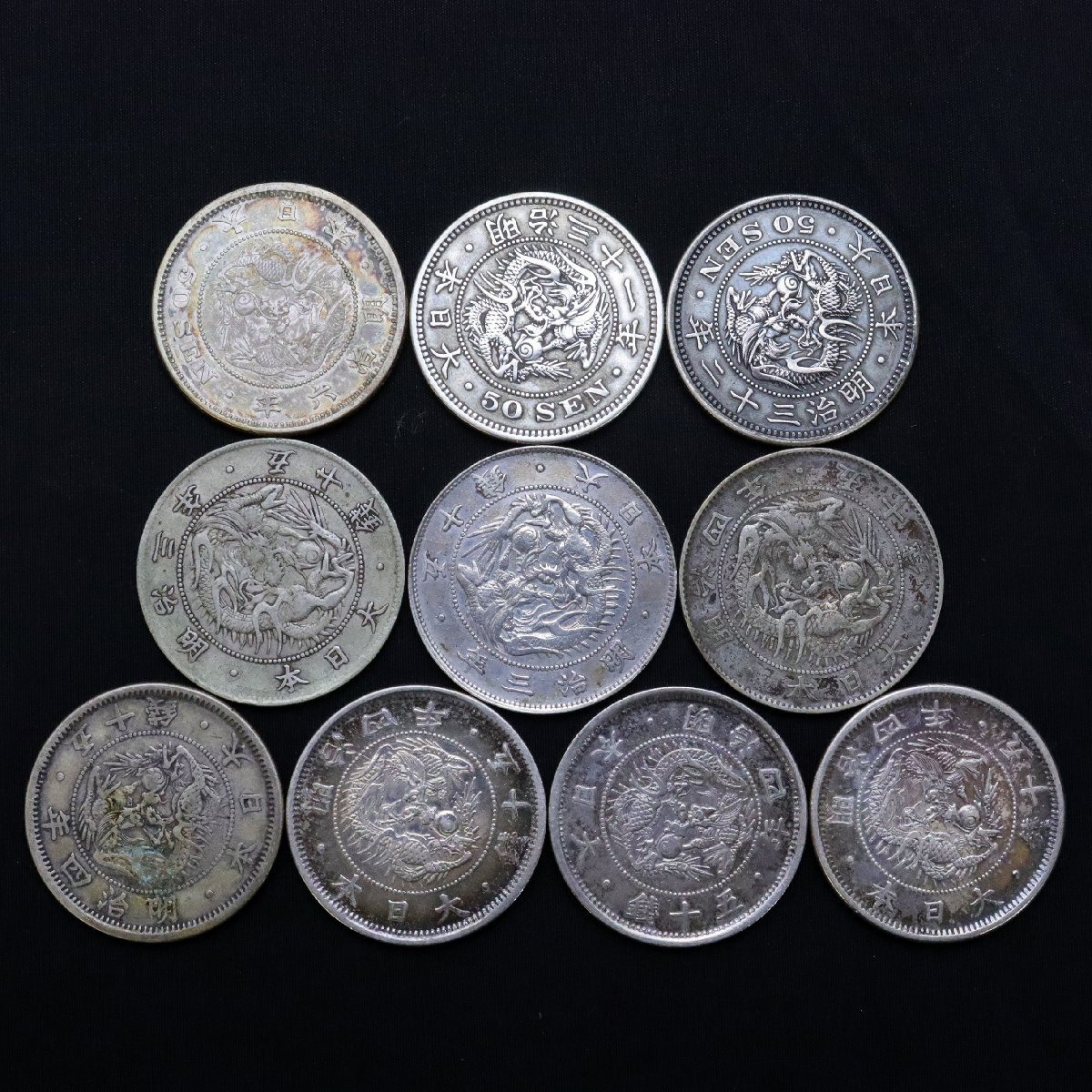 - 日本の古銭 竜50銭銀貨(M6.M31.M32 各1)旭日竜大型50銭銀貨(M3×2.M4×1)旭日竜小型50銭銀貨(M4小竜×4)計10枚◆おたからや【x-C03535】
