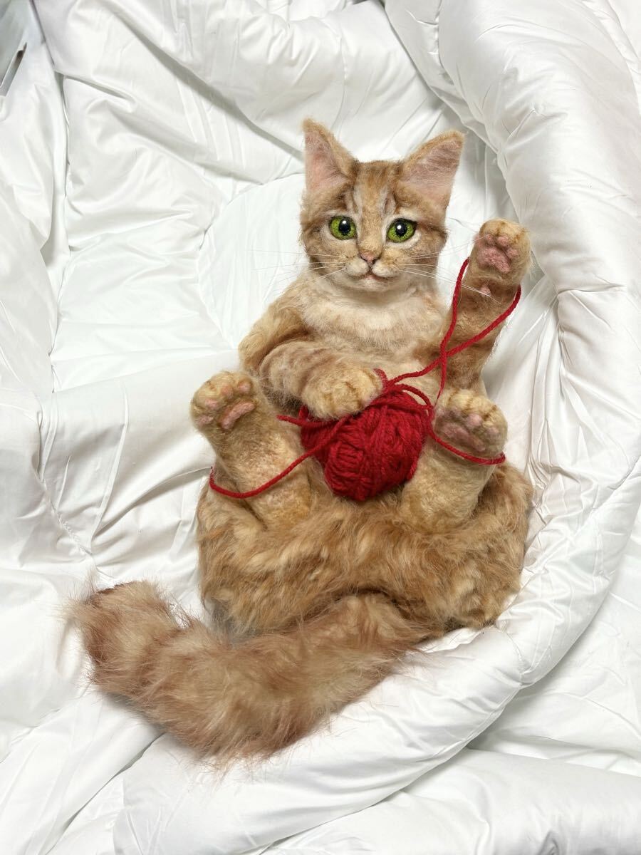 - 羊毛フェルト 毛糸で遊ぶ茶トラ猫【ハンドメイド ぬいぐるみ