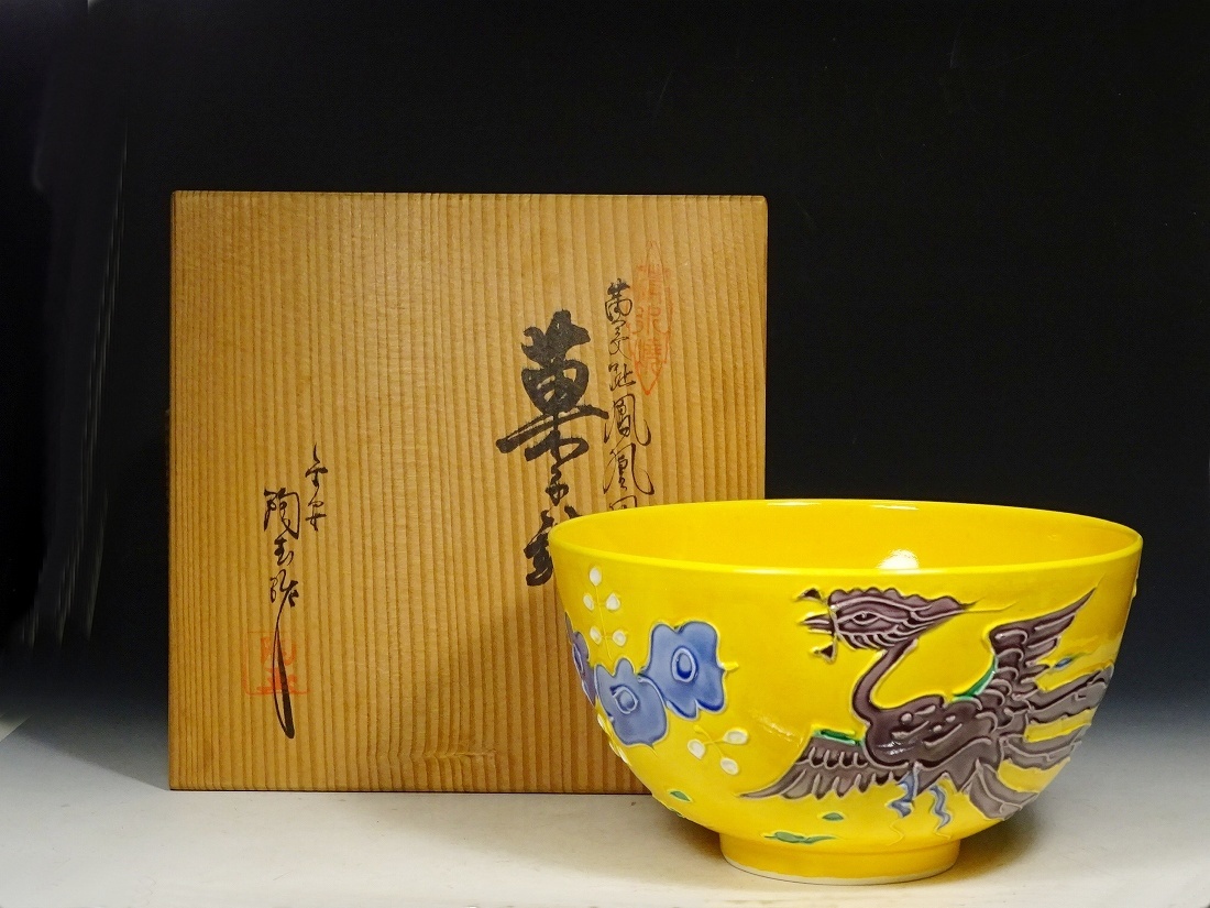 - 8777■菓子鉢 清水焼 平安 陶玉 黄交趾鳳凰図 菓子鉢 共箱 茶道具