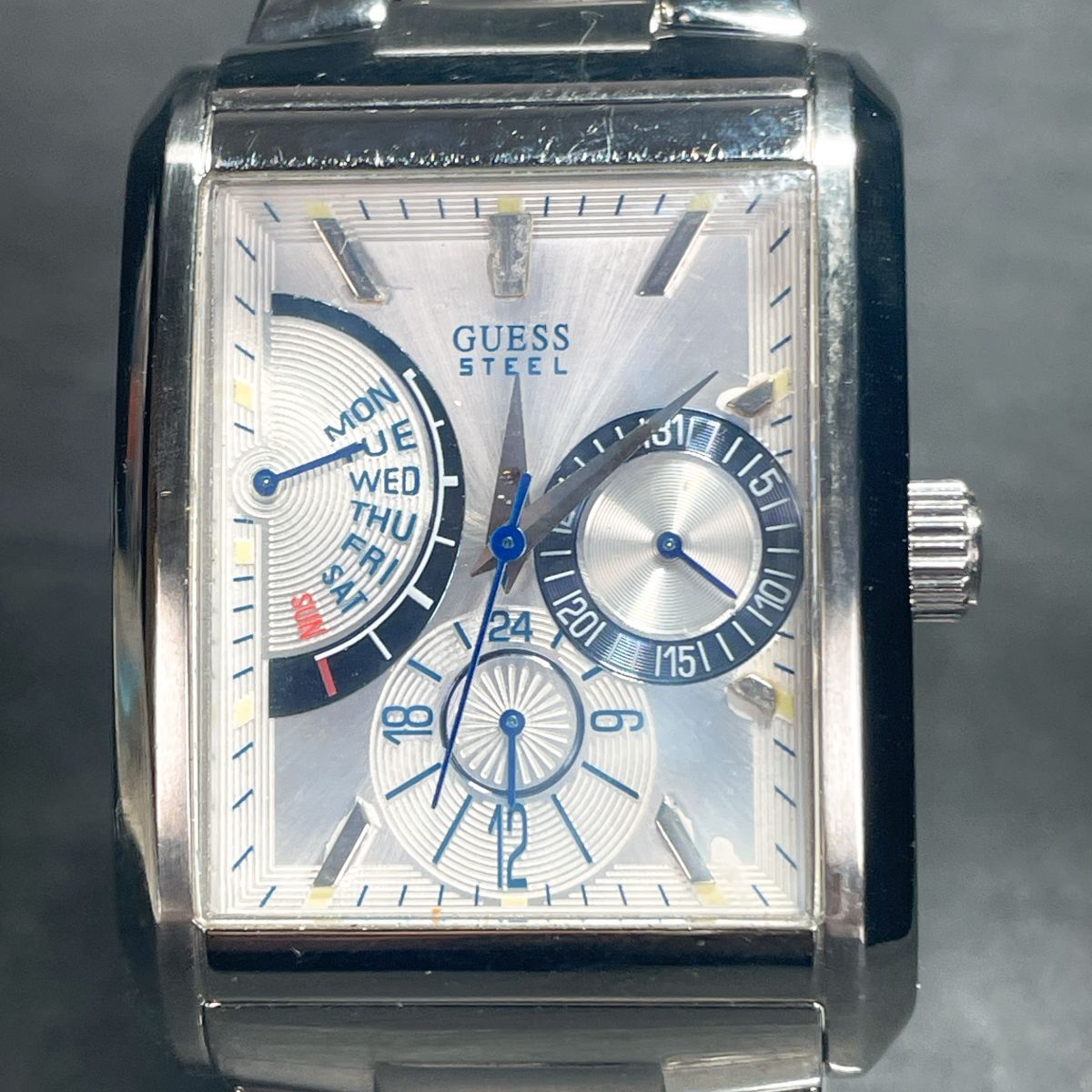 - 美品 GUESS ゲス 113520G1 腕時計 アナログ クオーツ マルチファンクション シルバー スクエア メタルバンド 新品電池交換済み 動作確認済