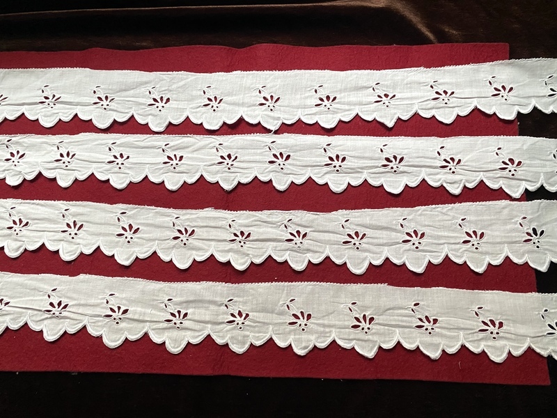 | ★商品説明 | ★夫々同じデザインの手刺繍が施されている、とっても可愛らしいお花と、下部縁のウェイヴフリルが施されているガロンレースです。とっても愛らしく可愛らしいお花とウェイヴフリルの手刺繍がとても素敵です。フランスらしくとっても可愛らしく素敵です♪ ★大きさは、夫々の生地幅5.5(内、手刺繍部分のみ幅4.5cm)×長さ62、70、65、68㎝程です。ご活用下さいませ