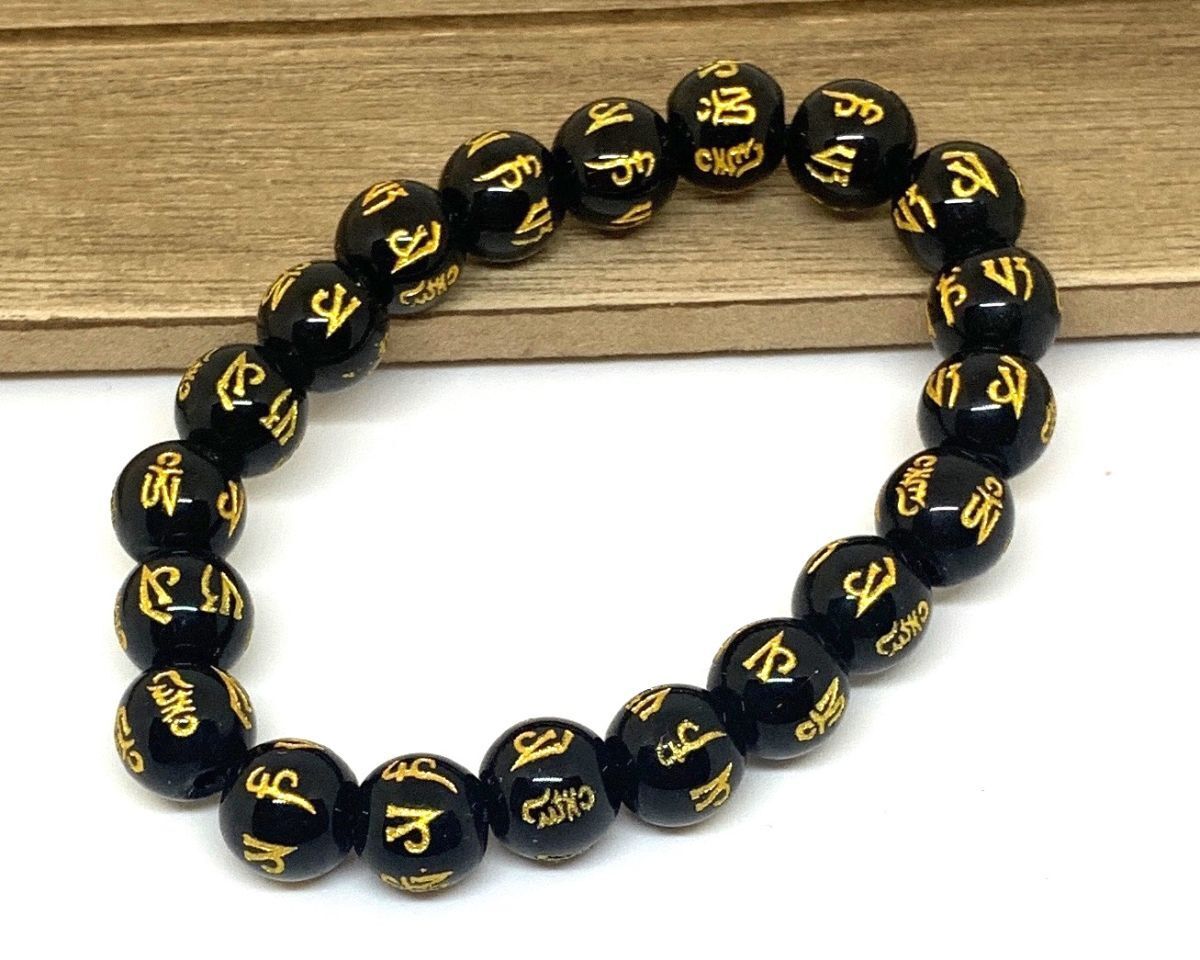 - 【Premio Fortuna】黒樹脂六字真言(マントラ)ブレスレット 10ミリ珠 全珠に金の真言刻印 C6hmZ5z9 036