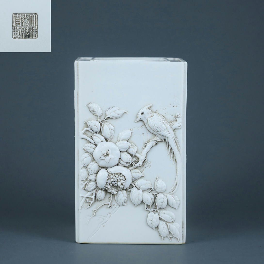 - ▼渡鶴羽▼A0746清光緒 白磁浮彫花果鳥紋四方筆立・古陶磁器 ・珍品旧蔵・古賞物・時代物