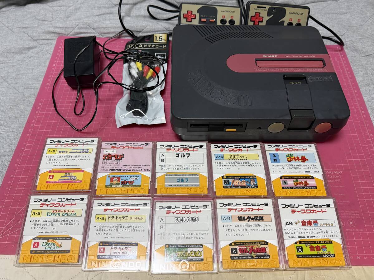 > FC AN-500B ツインファミコン黒 初期型 ディスクシステム 本体 ACアダプタ カード10枚 追加ok セット ゴムベルト 中古 動作確認 送料無料