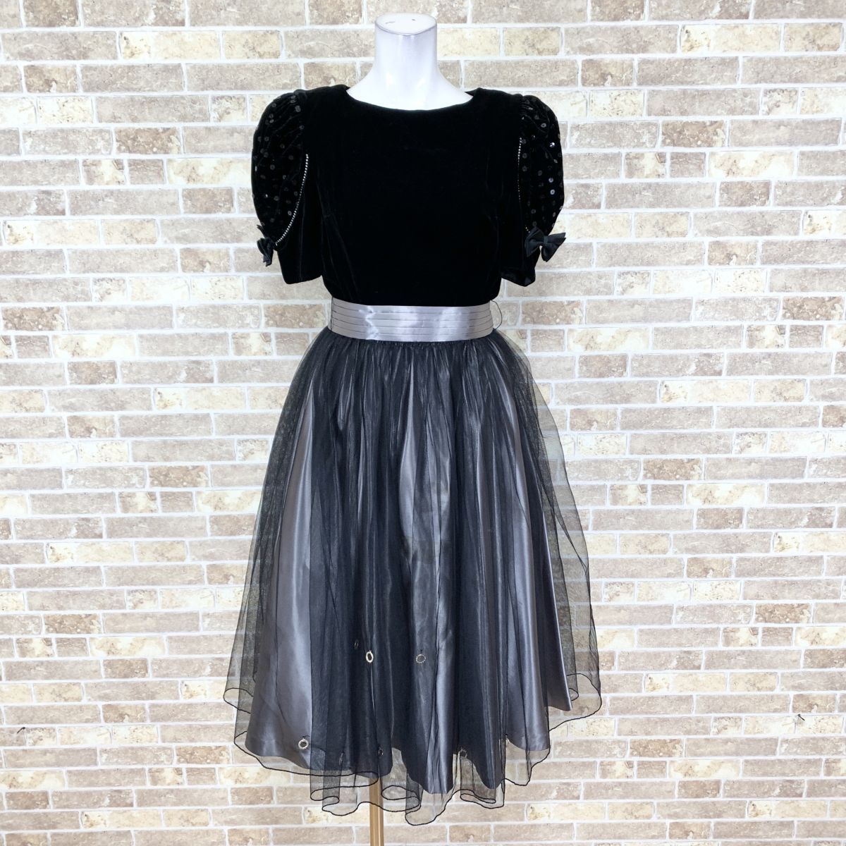 > 1円 GENETVIVIEN ジュネビビアン ワンピース ベルベット黒 シルバーグレイ系 肩パット 中生地汚れ多い 中古17109