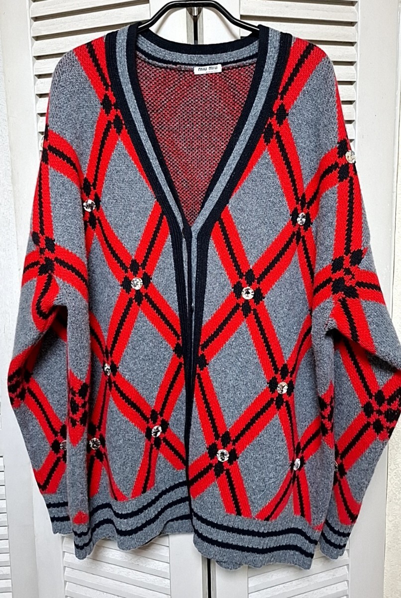 - 美品 ニット カーディガン MIU MIU ミュウミュウ バージンウール ラインストーン Vネック トップス オーバーサイズ 38