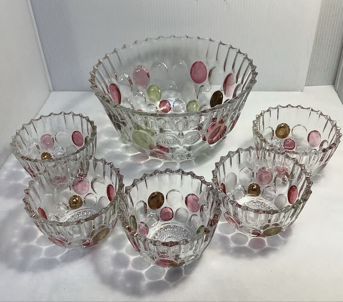 - 昭和レトロ 硝子 カラフル 水玉 ドット サラダボウル 鉢 器 キャンディーポット デザート器 フルーツポンチ ガラス食器 曽我ガラス SOGA