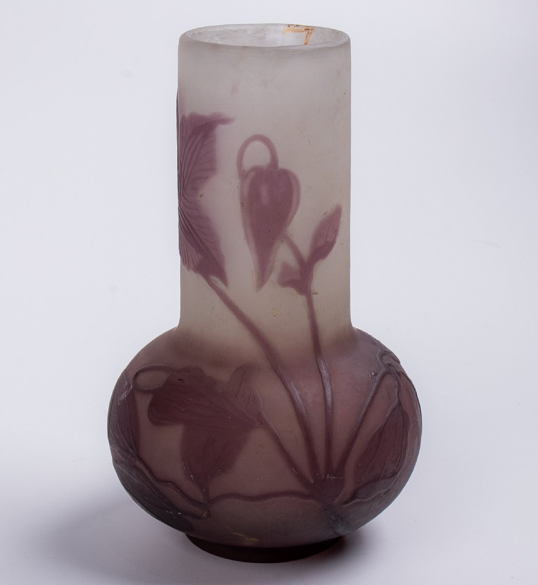 - 【アンティーク】 Emile Galle エミールガレ ウランガラス 鶴首スミレ文花瓶 岩崎紘昌識箱付 E1970 西洋美術 古美術 骨董 古玩 唐物