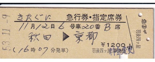 - 鉄道切符 硬券 国鉄 きたぐに 急行券・指定席券 秋田→京都