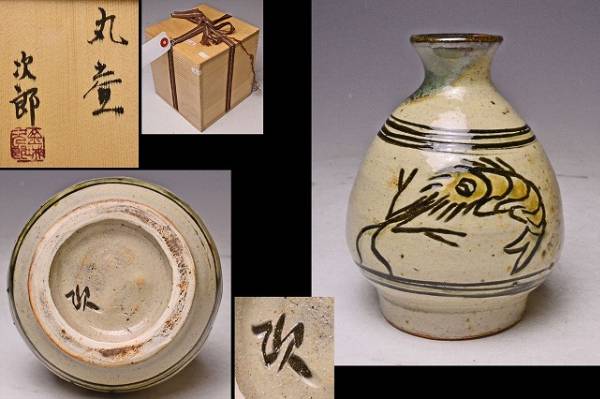 > 金城次郎 ★ 海老文丸壺 ★ 共箱 ★ 人間国宝 ★ 壺屋焼 ★ 灰被 ★ 検 徳利 酒 ★ 素朴な海老