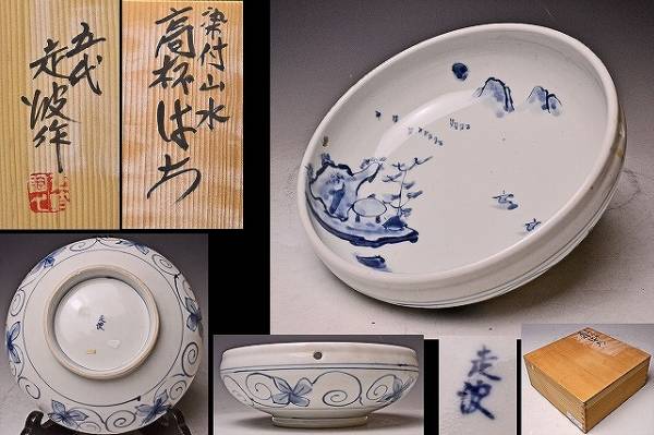 - 佐藤走波 ★ 染付山水高杯鉢 ★ 共箱 ★ 検 走波焼 唐物写 染錦色絵