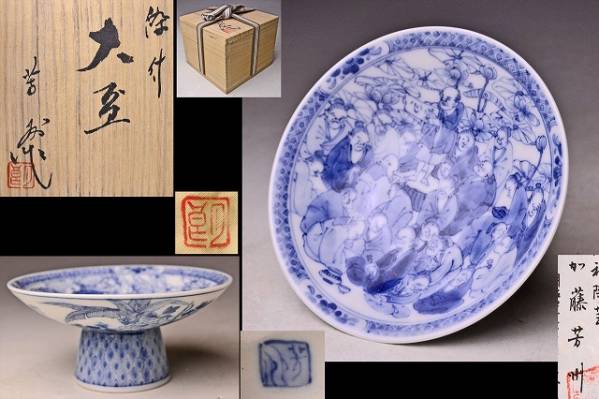- 加藤芳州 ★ 染付寿老人図大盃 ★ 共箱共布栞 ★ 希少作 ★ 繊細な絵付 ★