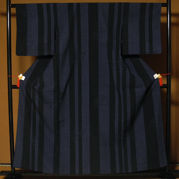 - 正絹 新品同様 衿裏難有り 縦縞に椿 塩沢紬 -単衣-