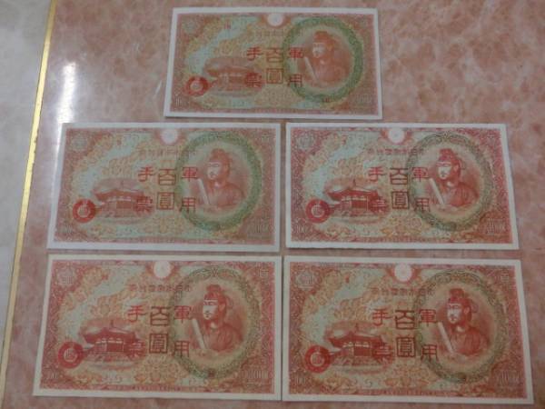 - ★ 日華事変軍票 丙号(異式)100円 極美品 5枚 ★ No.9