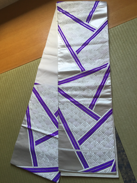 > 【袋帯】銀糸と紫 菊の地模様に幾何学模様 六通柄 長さ4m26cm