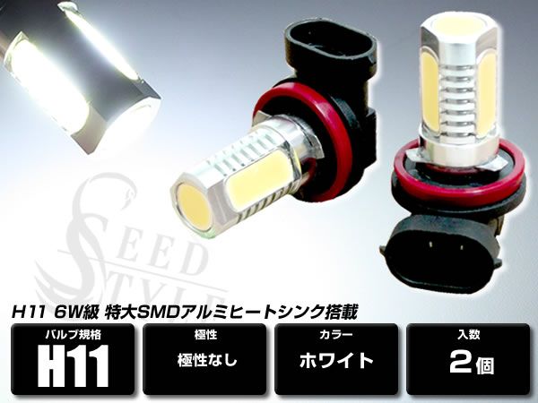 - H11 6W級 特大SMD ホワイト アルミヒートシンク搭載 2個セット