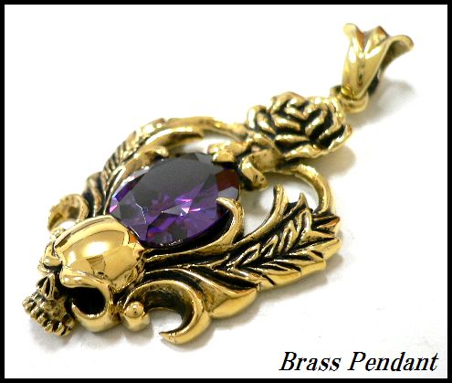 - 真鍮製Brassパープルジルコニア付スカル薔薇フェザー ブラス ペンダント