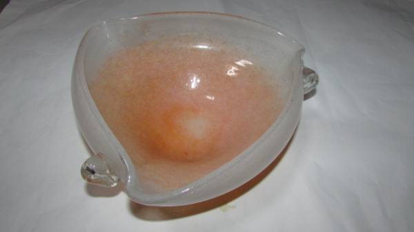 - (旧家・蔵出し)(レトロな全面気泡乳白色ガラスにマ-ブルガラス三耳付きガラス大鉢)貴重珍品